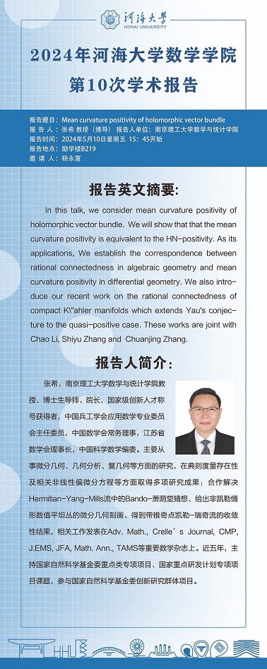 好色tv 第10次学术报告:Mean curvature positivity of holomorphic vector bundle