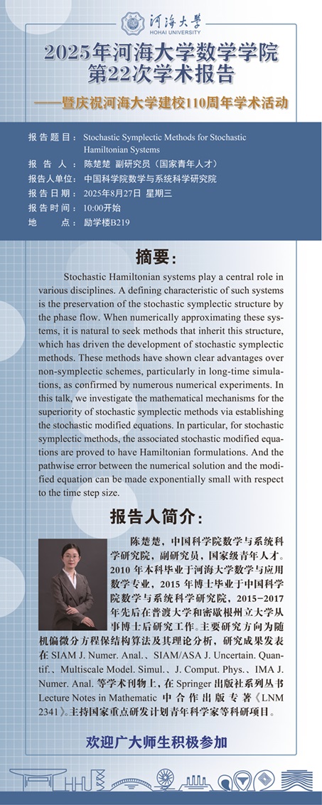 好色tv 第22次学术报告: Stochastic Symplectic Methods for Stochastic Hamiltonian Systems