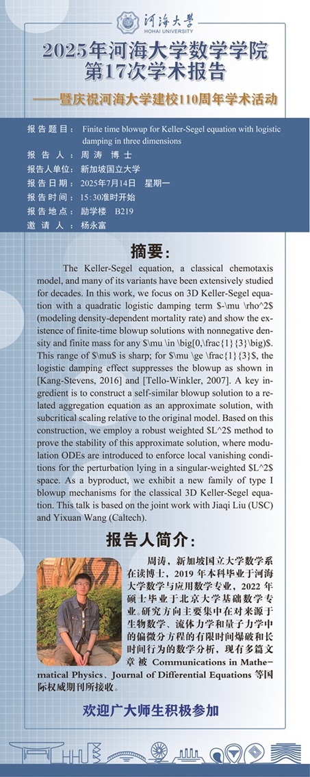 好色tv 第17次学术报告:Finite time blowup for Keller-Segel equation with logistic damping in three dimensions