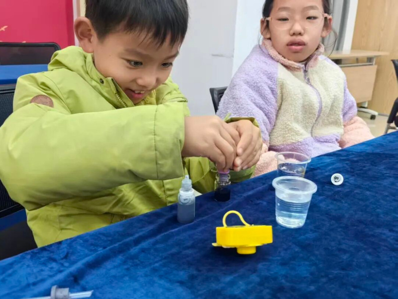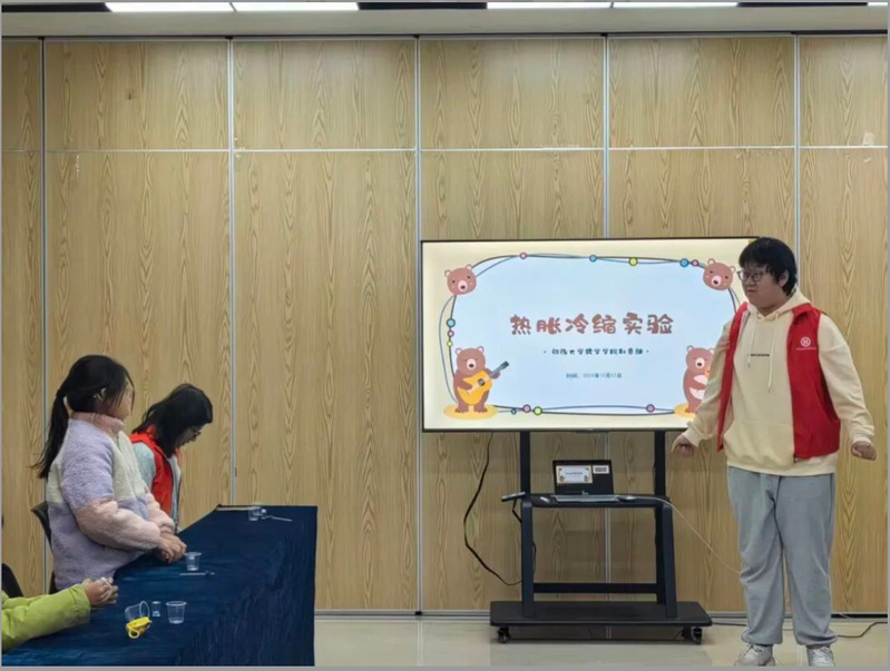 随后,志愿者带领小朋友们进入实验环节——热胀冷缩实验。利用生活中常见的材料如透明塑料瓶、吸管、色素水等,志愿者逐步演示并讲解了如何制作一个简易的温度计。在动手过程中,小朋友们观察到水温变化时,瓶内液柱会随之升降,志愿者借此引入“热胀冷缩”的科学原理。每一位小朋友都在志愿者的指导下完成了自己的“温度计”,并兴奋地测试不同水温下的变化。